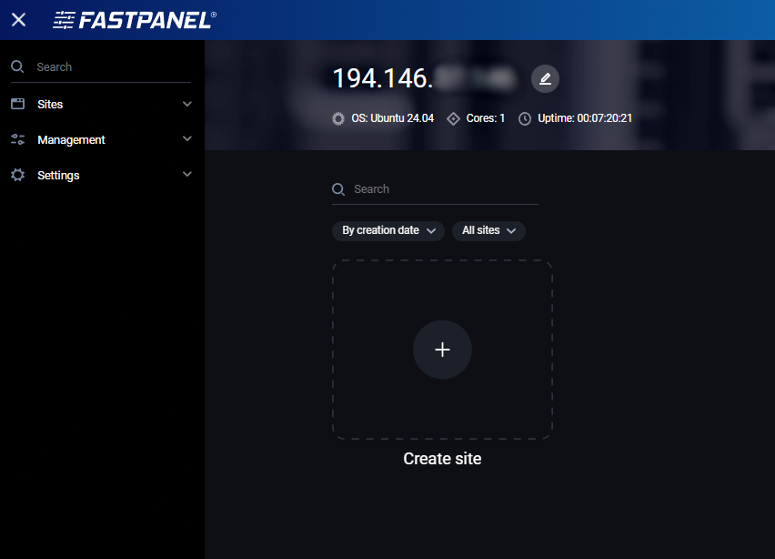 Kada unesete mail adresu i prihvatite uslove korišćenja prikazaće se početna stranica FastPanel-a: