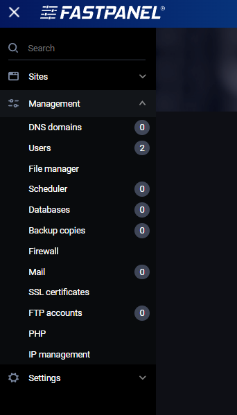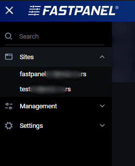 - Polje za pretragu - ovde možete pretraživati sajtove ili opcije dostupne u FastPanel-u