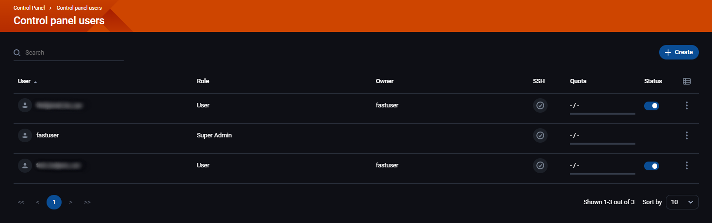 Iznad liste korisnika sa desne strane je plavo dugme + Create za kreiranje dodatnih korisnika: