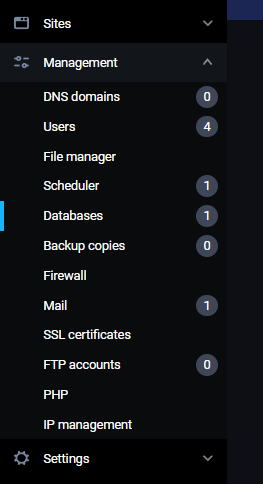 Za upravljanje bazama podataka, u meniju sa leve strane odaberite Management -> Databases: