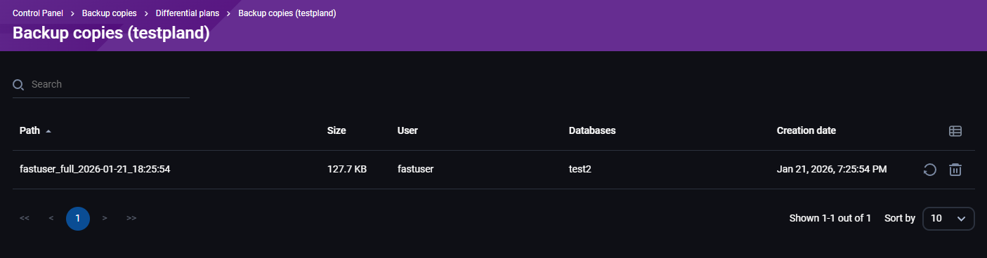 Klikom na listu backup-a otvara se stranica gde su izlistani diferencijalni backupi i detalji o njima: