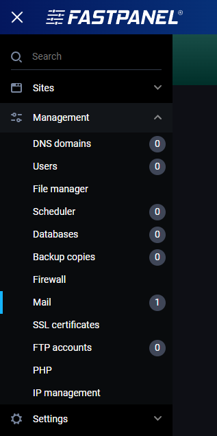 Da promenite lozinku na mail nalogu u FastPanel-u, u meniju sa leve strane pod Management odaberite Mail: