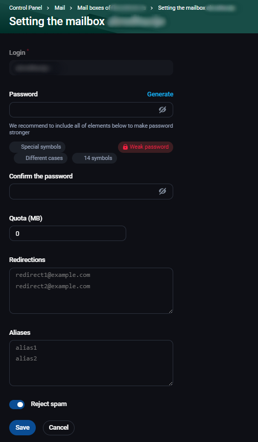 Otvoriće se stranica gde će biti prikazana polja koja se mogu izmeniti za taj mail nalog, u Password i Confirm the password unesite novu lozinku: